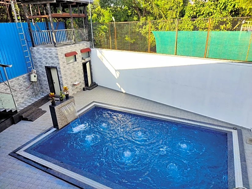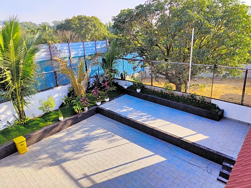 Outdoor space is with full grown trees and podium. The outdoor pool and tiled space are a perfect settings for you to relax and enjoy the chilled night Yeoor weather. It has an outdoor 1st floor lounge area with dinning faclity also you can enjoy the views from there.