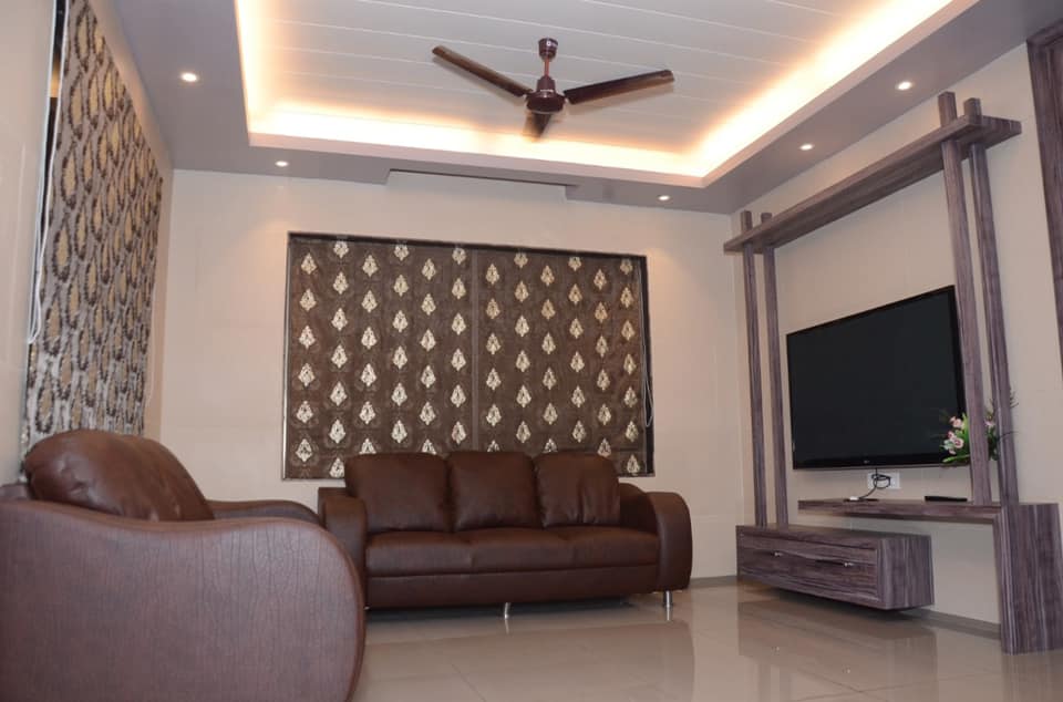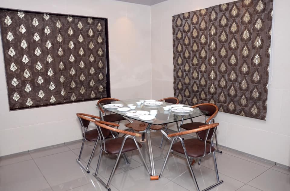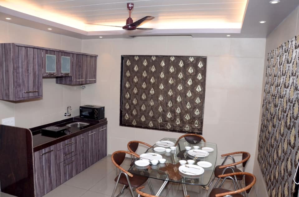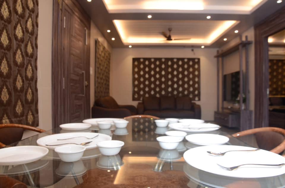 The comfortable living area is with comfortable sofas, flat big TV and Dinning Table with chairs.
